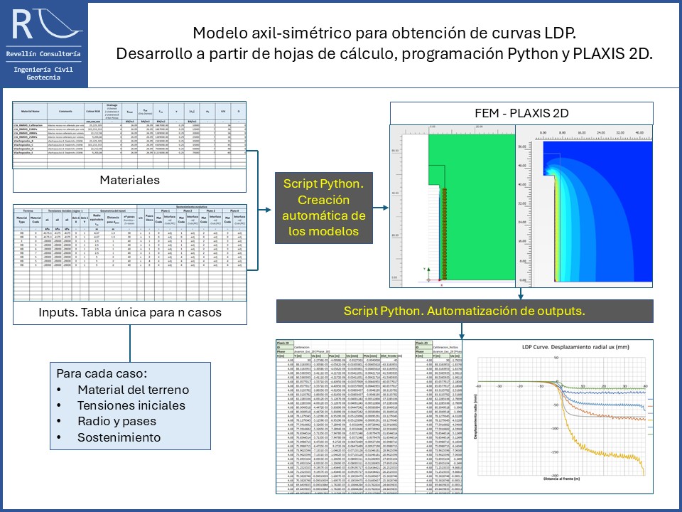 El desarrollo del modelo axil-simétrico para la obtención de la curva LDP es un proceso relativamente sencillo, que puede llegar a ser repetitivo en caso de representar los pases de excavación y un sostenimiento evolutivo. Por ello en Revellín Consultoría hemos desarrollado un script con lenguaje de programación Python que automatiza la generación de n modelos, la extracción de tablas de resultados a Excel y el dibujo de las gráficas para los mismos.
