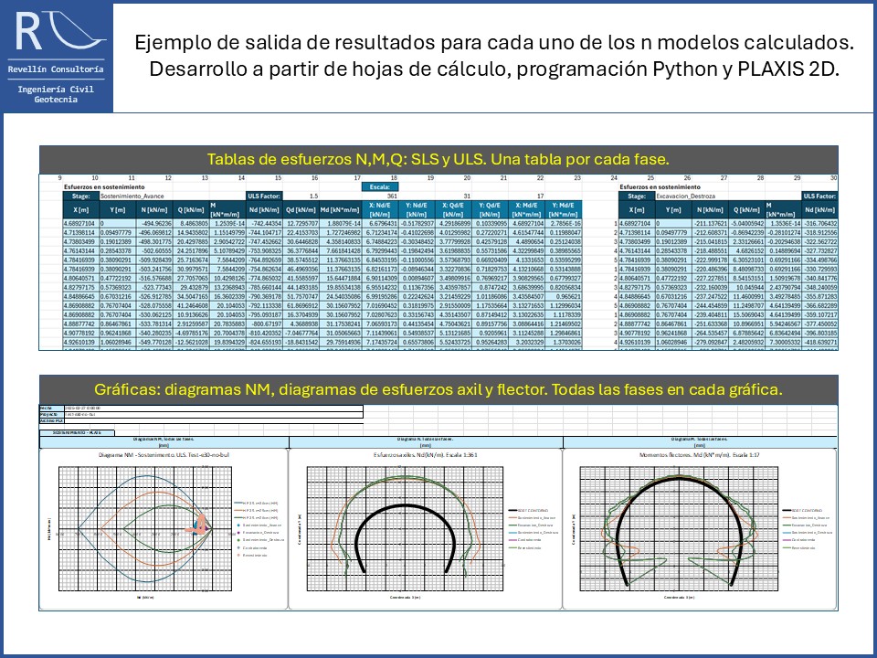 Una vez creados los n modelos con el script de inputs, para cada uno de ellos se extraen automáticamente los resultados a una misma hoja Excel, permitiendo disponer al ingeniero de los principales resultados ordenados y graficados. De esta manera podemos chequear rápidamente la capacidad estructural del sostenimiento y revestimiento en todas las fases con diagramas axil-momento de resistencia de la sección y comprender mejor el funcionamiento a través de los diagramas de distribución de axiles y momentos.
