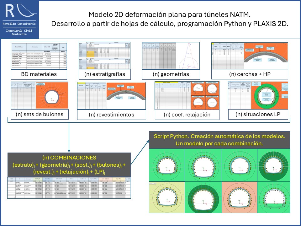 Para hacer frente a este esfuerzo de modelización de la manera más eficiente posible en Revellín hemos desarrollado un script Python en el que a partir de un solo libro Excel, se pueden generar todos los modelos PLAXIS 2D necesarios durante las distintas fases de proyecto y construcción. En ella se definen n-estratigrafías, geometrías, tipos de hormigón proyectado y cerchas, conjuntos de bulones, revestimientos y relajaciones que pueden ser combinadas tantas veces como el ingeniero requiera.